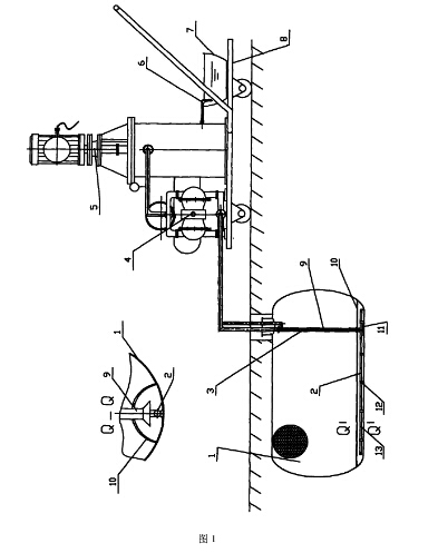 預(yù)先得知防爆儲罐內(nèi)的存儲油(介質(zhì))使用底線(即加油機抽不到油為止,如25M3的防爆儲汽油罐,剩余油量約為0.8M3)。此時打開防爆儲罐1人孔蓋,將豎井內(nèi)的防爆材料和豎井下部的清污隧道10移出罐外;將吸油管9(最好使用單個吸油管)插入到清污隧道10內(nèi),啟動氣動隔膜泵4將清污隧道10內(nèi)剩余油污輸送給自動清洗過濾器5進行過濾,過濾后的清潔油不送回防爆儲罐,另外儲存到容器內(nèi),直到將清污隧道內(nèi)的油污抽完為止。然后將設(shè)計多段的噴射橫管2放入到清污隧道10內(nèi)。由于豎井的尺寸有限,噴射橫管2中間設(shè)計為能通過豎井放入到清污隧道10內(nèi)為好,其余兩段或多段的噴射橫管與中間段噴射橫管用對接管頭對接一體,并用卡箍固定好清污隧道10內(nèi),再將噴射豎管2和吸油管9與其連接(如使用同心的噴射豎管3和吸油管9是應(yīng)將單個吸油管取出),并將與豎井固定好,同心的噴射豎管3和吸油管9快速接頭14應(yīng)由盲板保護。這里說明的是同心設(shè)置的噴射管和吸油管只是安裝到位,為下一次清污作業(yè)使用的。