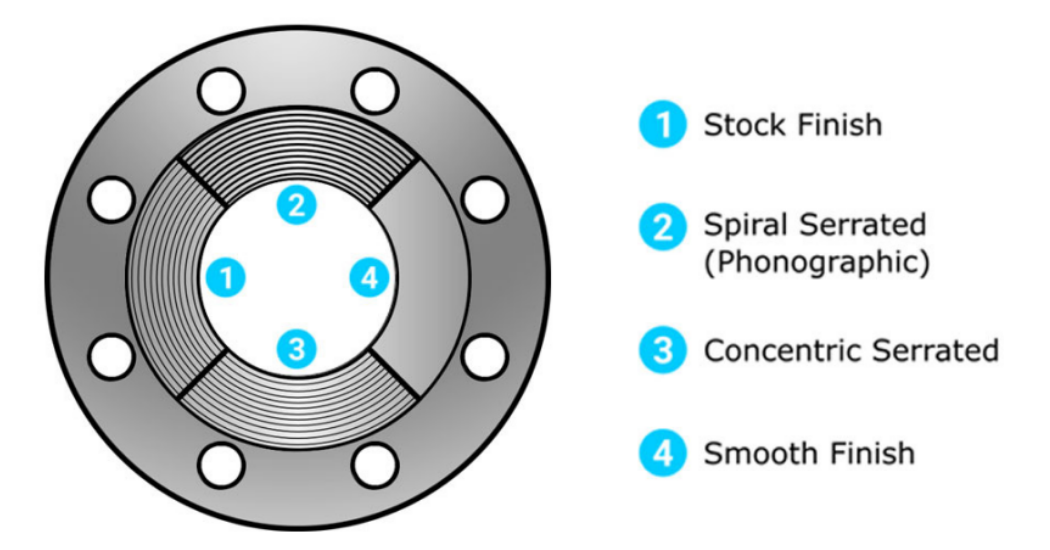 ASME B16.5 和 B16.47 法蘭的 4 種基本表面處理是庫存表面處理、螺旋鋸齒表面處理、同心鋸齒表面處理和光滑表面處理。