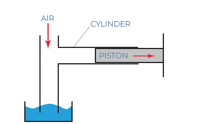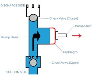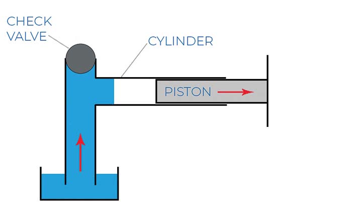 以同樣的方式,泵中的隔膜向泵體內(nèi)和向外移動(dòng),與止回閥一起工作以吸入和排出泵中的流體。下面的圖 2 顯示,如果沒有止回閥,當(dāng)活塞向外移動(dòng)時(shí),空氣會(huì)簡(jiǎn)單地流入氣缸,從而阻止任何吸入。