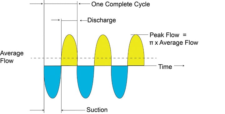 1. 泵送動作是由往復動作發(fā)展而來的。這種往復運動產(chǎn)生流動正弦波。實際流量由圖 1 中的公式確定。