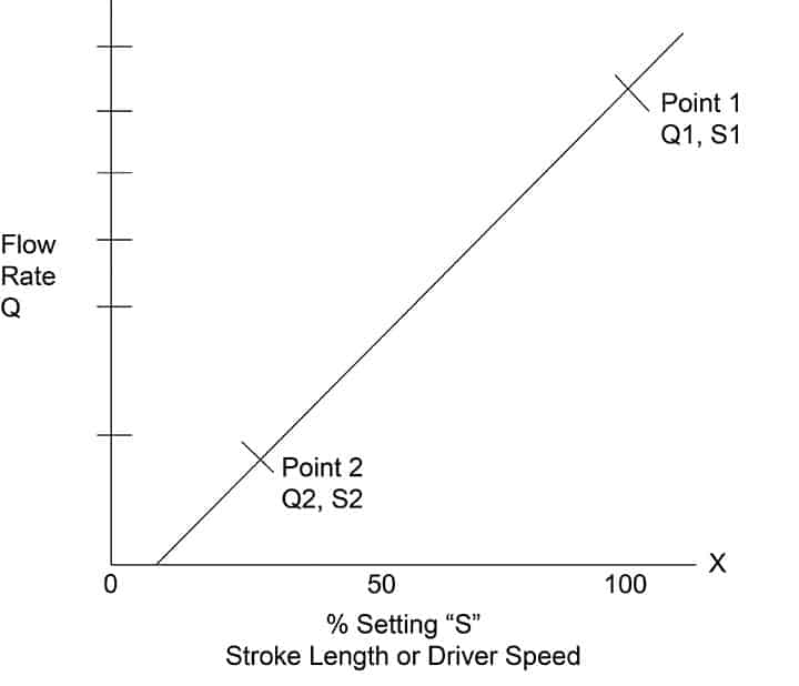3、計量泵流量與沖程特性曲線呈線性關(guān)系(圖3)。然而,它不一定成比例,因為 50% 的沖程設(shè)置可能不等于 50% 的流量。這是因為校準線可能不會同時通過兩個軸上的 0。通過在兩個沖程設(shè)置下測量流量,繪制兩個點并通過它們畫一條直線,可以準確預測其他流量與沖程的關(guān)系。
